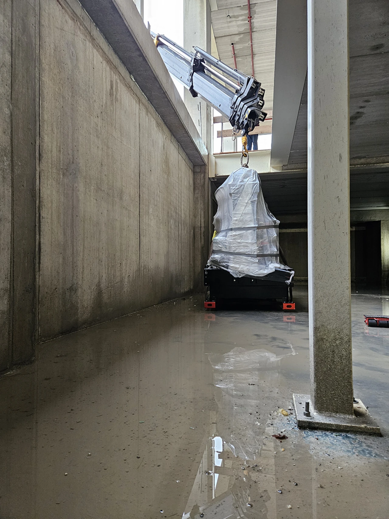 De grootste uitdaging was het inhijsen van het noodstroomaggregaat (NSA). Deze moest via een smalle doorgang naar beneden worden gebracht, terwijl het plafond van het dak al volledig was geplaatst. Met passen en meten en dankzij de vakkundige samenwerking met de transporteur is het gelukt unit gecontroleerd en veilig naar beneden te hijsen.